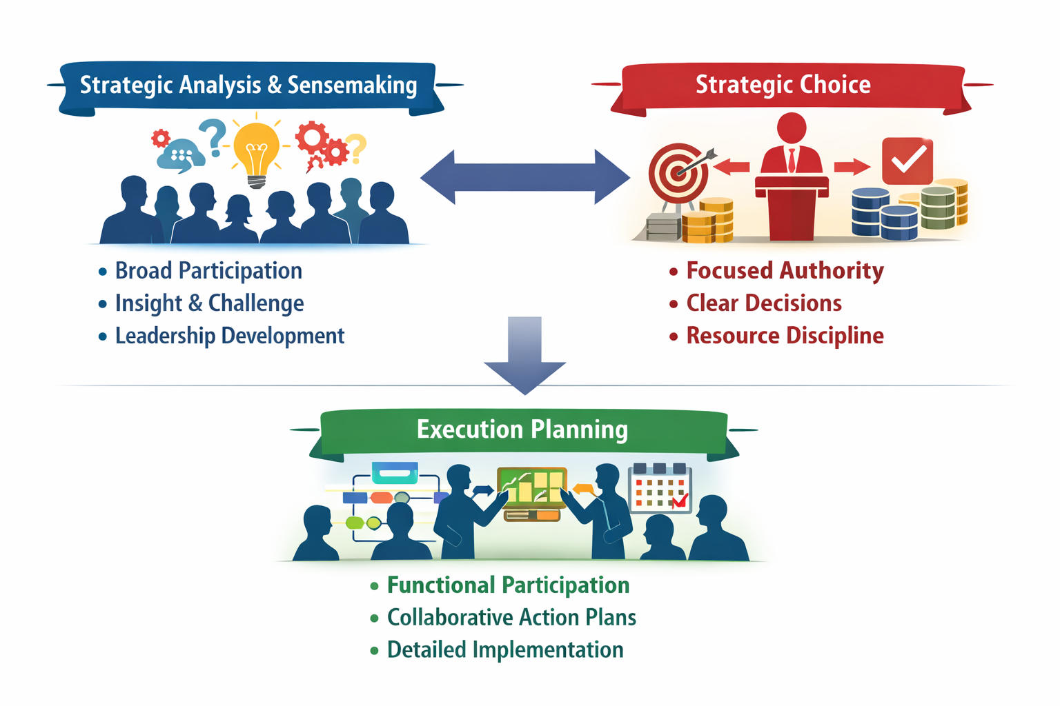 Execution planning can then re-expand participation at the functional level, where detailed action plans are refined collaboratively.In this design, strategy becomes both disciplined and developmental. It integrates exploration with exploitation. It allows assumptions to be challenged without abandoning coherence. It treats strategic planning not merely as a decision event, but as an organizational capability.